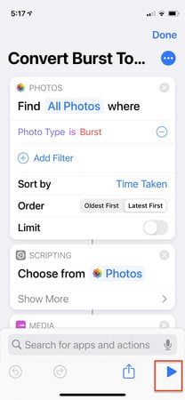 - Ejecuta el acceso directo al tocar la flecha en la parte inferior derecha. Mostrará una lista de todas tus fotos en ráfaga.
