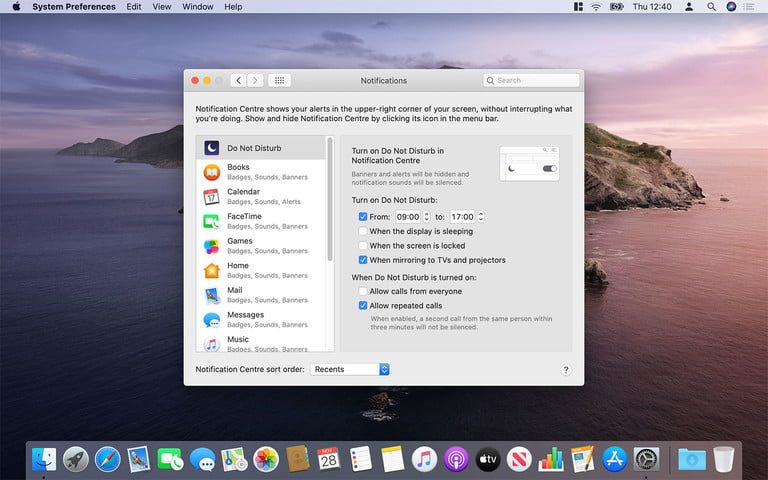 Paso 4: hay varias posibilidades aquí. Puedes hacer que No Molestar se active a horas establecidas (por ejemplo, durante tus horas de trabajo si usas la Mac para su trabajo) o cuando la pantalla está inactiva o bloqueada. También puedes habilitarlo cuando la pantalla de la Mac se duplique en televisores y proyectores para que no te veas interrumpido durante una película o presentación.