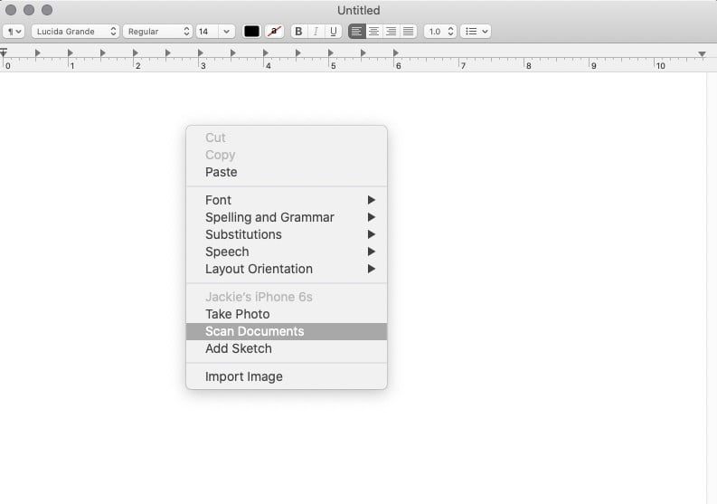 - Mantén presionada la tecla Control o haz clic con el botón derecho en el documento o ventana de Mac donde desees que aparezca tu escaneo, y selecciona Escanear documentos, o en el Finder, selecciona Importar desde iPhone> Escanear Documentos. También puedes acceder a la función de escaneo haciendo clic en Archivo o Insertar en el menú. Encontrarás esta opción bajo Acción en el Buscador. En tu Mac, puedes acceder a esta función haciendo clic con el botón derecho para abrir el menú.