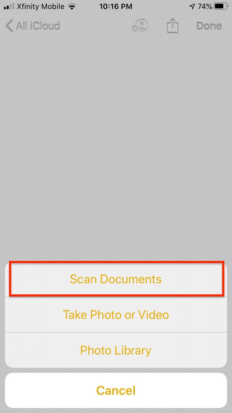 - Desde tu nueva carpeta Escanear, desliza hacia abajo nuevamente para tocar el botón Más de tres puntos y selecciona Escanear documentos para activar la cámara.