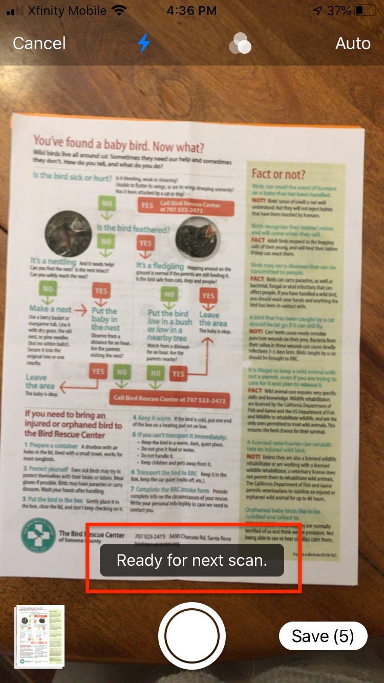 - Después de que la cámara dispara la primera página, la aplicación dice Listo para escanear la parte inferior. Quita la primera página para que pueda capturar la segunda.