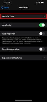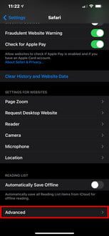 Paso 6: mientras estás en el panel de Safari, desplázate hacia abajo y toca Avanzado.