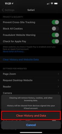 Paso 5: toca Borrar historial y datos nuevamente en el mensaje deslizable.
