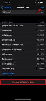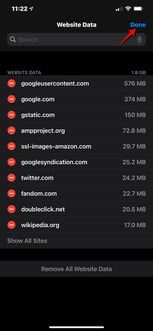 Mira en la parte superior de la lista y verás la cantidad de datos de sitios web que Safari almacena en tu dispositivo. En nuestro ejemplo, ¡es un considerable 1.8 GB!