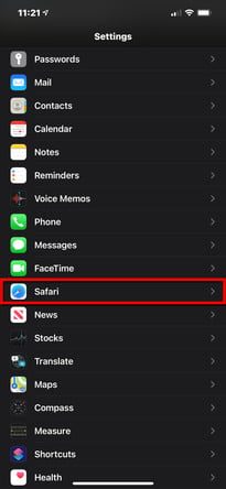 Paso 2: desplázate hacia abajo y toca Safari. Aparece junto con otras aplicaciones propias de Apple.