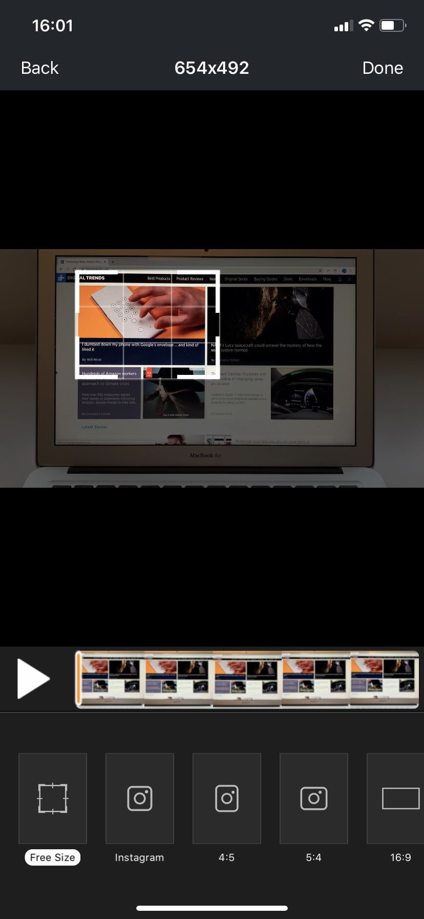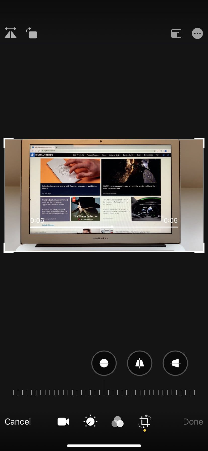 Paso 3: toca el icono Recortar-rotar en la parte inferior de la pantalla Editar. Una vez que estés en el modo Recortar, mantén presionada una de las esquinas del video. Luego arrastra el borde hacia adentro hasta el punto deseado. Repite el proceso con cualquier otra esquina hasta que haya terminado de recortar.