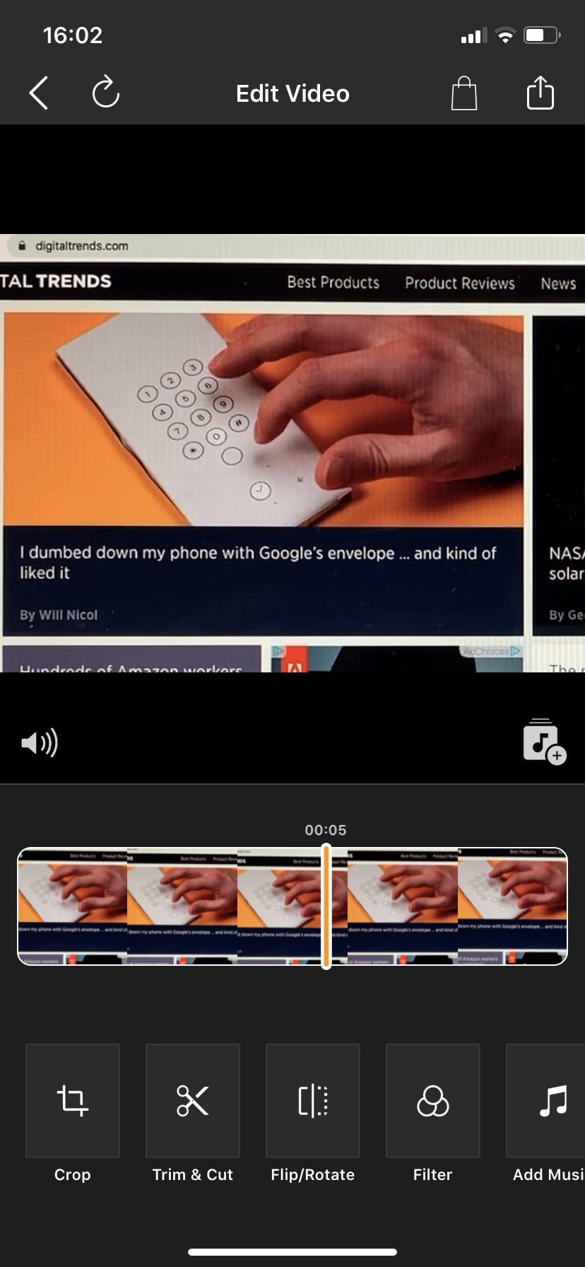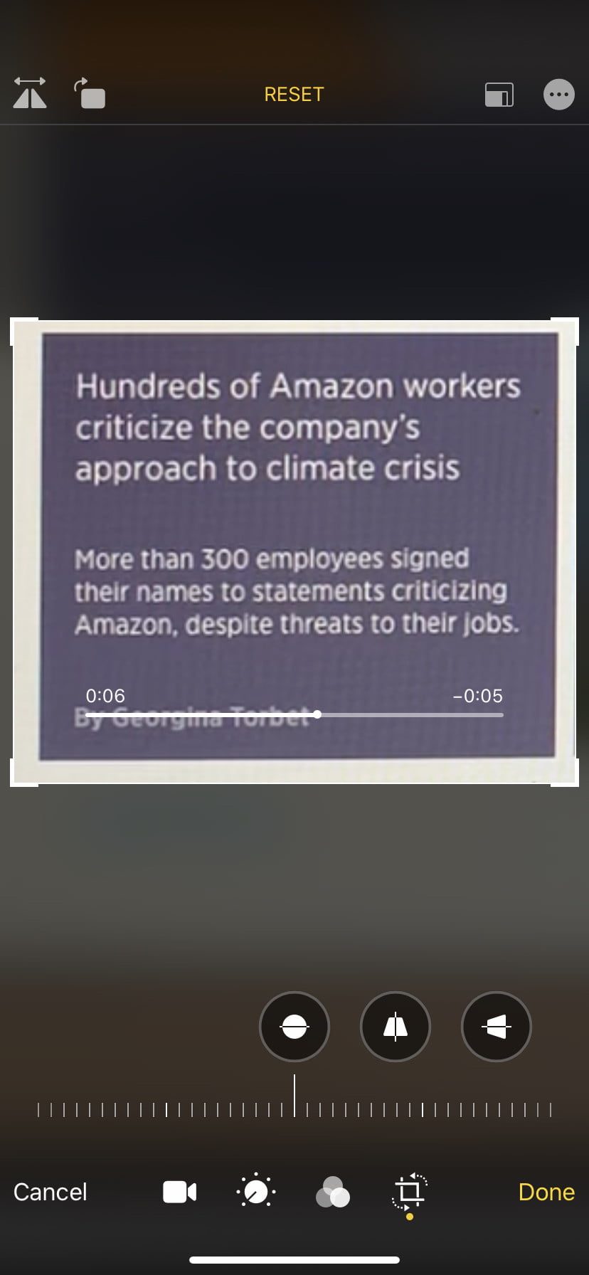 Paso 2: toca Recortar en la esquina inferior izquierda de la pantalla. Luego, comienza a arrastrar una de las esquinas del video, moviendo el borde hacia adentro hasta que hayas recortado la parte deseada del video. Repite con cualquier otra esquina hasta que haya terminado de editar.