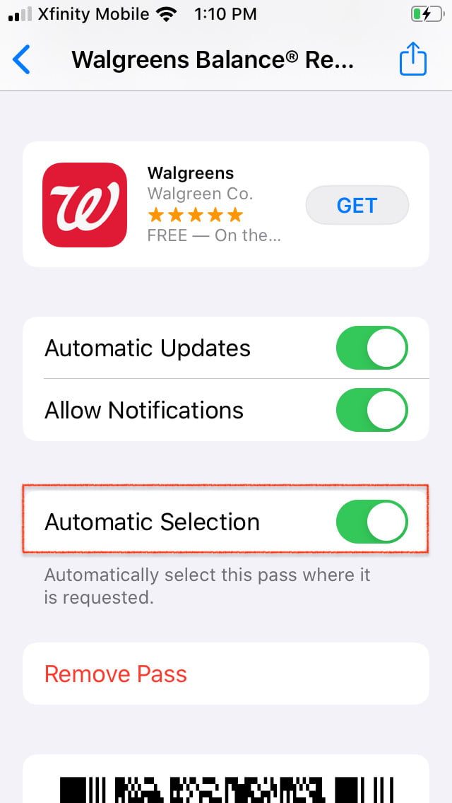 También puedes agregar varias tarjetas de recompensas a la aplicación Wallet para usarlas con Apple Pay. En lugar de elegir Agregar crédito o Tarjeta de débito, puedes agregarla como uno de tus Pases. Una vez hecho, puedes hacer que aparezca automáticamente en una tienda abriendo la aplicación Wallet, tocando la tarjeta y el icono «i«, y activando la Selección automática.
