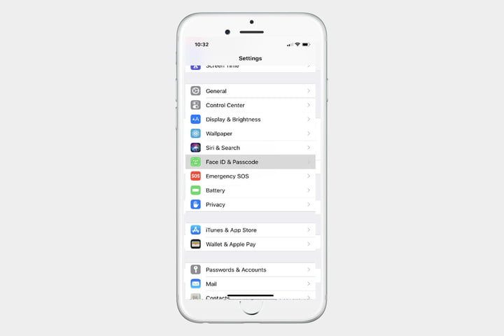 Primero, elige un lugar con buena iluminación y sin sobresaturación de luz potencial. Desbloquea tu iPhone. Dirígete a Configuración (el ícono del engranaje), y busca a través de éste el menú Face ID & Passcode (código de acceso). Selecciónalo.