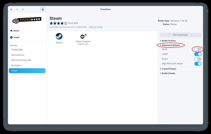 Para jugar Counter Strike 2 en tu Mac usando Crossover, instala el programa y después busca Steam. Antes de instalar, asegúrate de activar la opción DXVK y listo, comienza a instalar Counter Strike 2 desde tu Biblioteca de Steam.