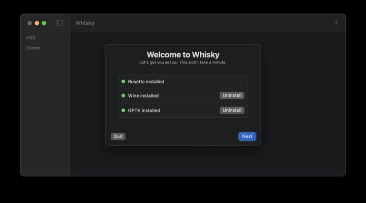 Para instalar Whisky, descarga la última versión para Mac y da doble clic en el ZIP para descomprimir. Luego arrástralo a la carpeta Aplicaciones. Se instalarán de forma automática Rosetta, Wine y Apple Game Porting Toolkit (GPTK), todas herramientas que Whisky necesita para funcionar.