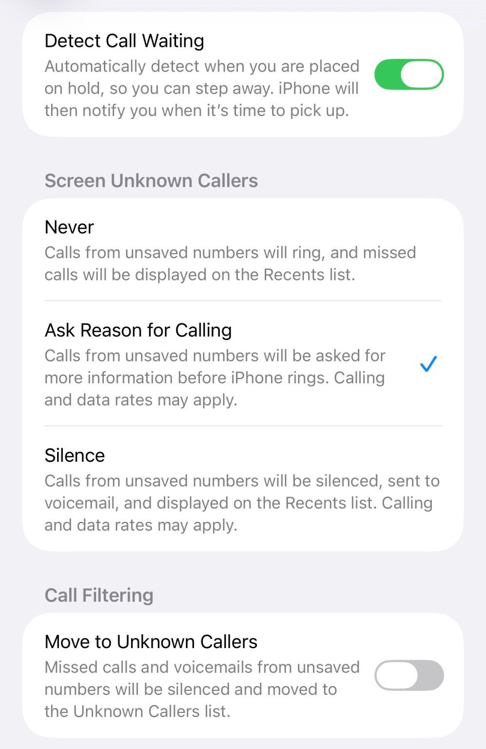El teléfono ahora tiene configuraciones actualizadas para silenciar llamadas desconocidas y administrar la nueva función de detección de llamadas.