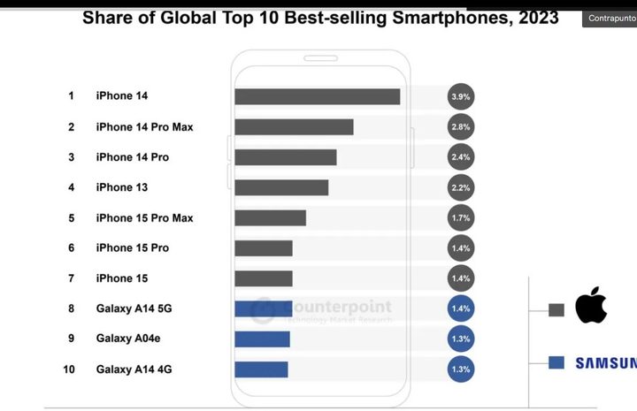 El iPhone 14 fue el smartphone más vendido de 2023. Logró capturar el 19% de las ventas totales de iPhone en 2023, lo que, según el informe, no es tan impresionante como la participación del 28% del iPhone 13, el superventas de 2022.