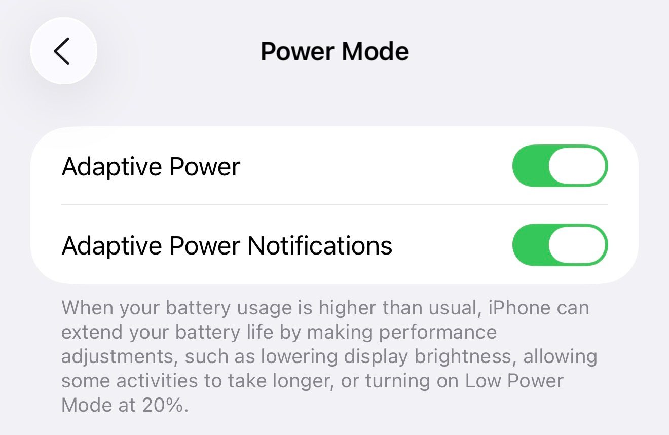 • La configuración del modo de energía incluye una nueva opción para las notificaciones de energía adaptativas, posiblemente para alertar a los usuarios cuando el rendimiento puede disminuir para preservar la batería. La palanca es independiente de Adaptive Power, lo que brinda a los usuarios control sobre la experiencia.