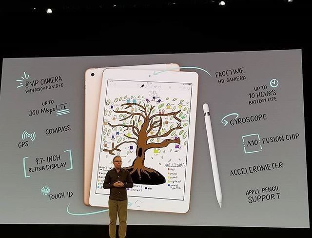 Todavía tiene una pantalla Retina de 9.7 pulgadas, pero la nueva iPad incluye un chip A10 Fusion (el mismo que alimenta el iPhone 7 y 7 Plus), una cámara frontal HD, Touch ID, 32GB de almacenamiento, una cámara trasera de 8 megapíxeles, cámara con video HD de 1,080p, y hasta 10 horas de duración de la batería.