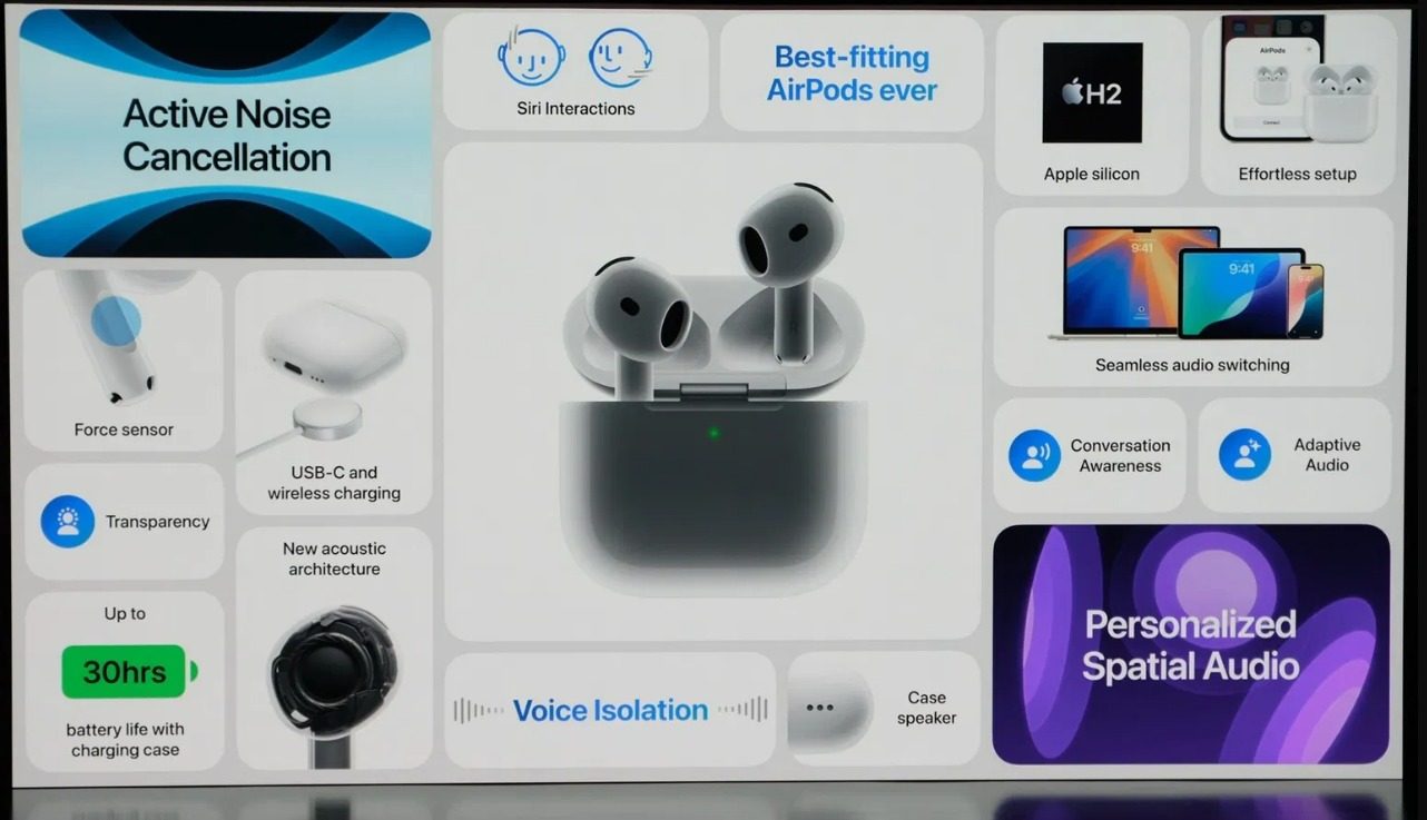 Han llegado los AirPods 4. Los auriculares más vendidos tienen varias características nuevas impulsadas por el chip H2. Hay mejores graves y agudos mejorados para el audio, incluido el audio espacial personalizado. Cuenta con una carcasa USB-C, la más pequeña hasta la fecha.