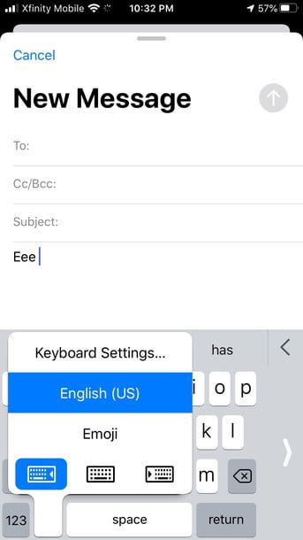 Puedes acceder a una serie de funciones especiales para el teclado del iPhone a través del icono de carita feliz (emoji) en la esquina inferior izquierda de la pantalla. Mantén pulsado este icono y aparecerá un menú con acceso rápido a la configuración del teclado. Verás una lista de los teclados que están instalados en tu teléfono: la mayoría solo tendrán su teclado en el idioma nativo y el teclado Emoji. Puedes agregar un teclado de idioma diferente o incluso cargar un teclado de terceros que hayas descargado de la App Store. También verás teclados de aplicaciones que puedes haber instalado que también instalan tus propios teclados. Si tiene instalados teclados de terceros, puedes ver un icono de globo en lugar del icono de carita feliz. Esta función se usa idénticamente en iOS 13 y iOS 14.