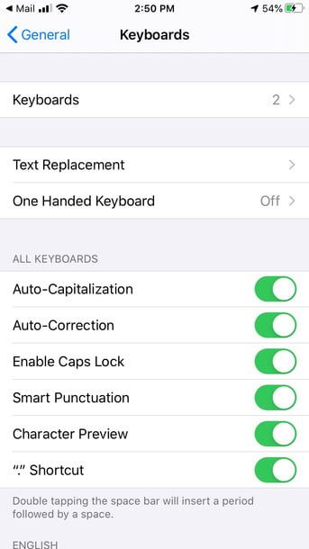 Puedes ahorrar mucho tiempo empleando la puntuación inteligente. ¿Cómo? Si la tienes activada, basta con teclear dos veces la barra de espacio cuando hayas concluido una frase y aparecerá la puntuación. Por otro lado, cuando escribes un doble guion, el teclado sabe que se supone que es un solo guion largo y lo coloca automáticamente. Algo más: si activas la puntuación inteligente, cuando termines de escribir una frase, puedes presionar dos veces la barra espaciadora, y en lugar de dos espacios, tendrás un punto y un espacio. Esta función se usa idénticamente en iOS 13 y iOS 14.