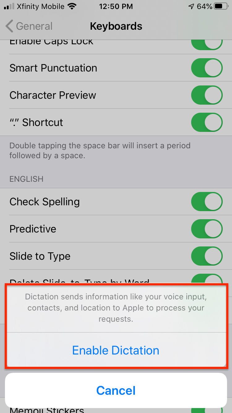 Puedes habilitarla tocando Configuración> General> Teclado y activando Dictation. Recibirás un mensaje para confirmar que es lo que deseas. Después de eso, cada vez que abras un documento, puedes presionar el pequeño ícono del micrófono y comenzar a hablar.