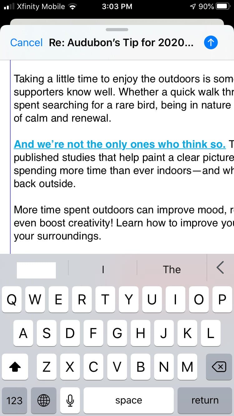 Si estás en medio de un documento, el teclado del software ocupa mucho espacio en la pantalla, y si necesitas revisar tu texto, se interpondrá. Puedes ocultar fácilmente el teclado en la pantalla deslizando hacia abajo desde el centro de la pantalla para eliminarlo.