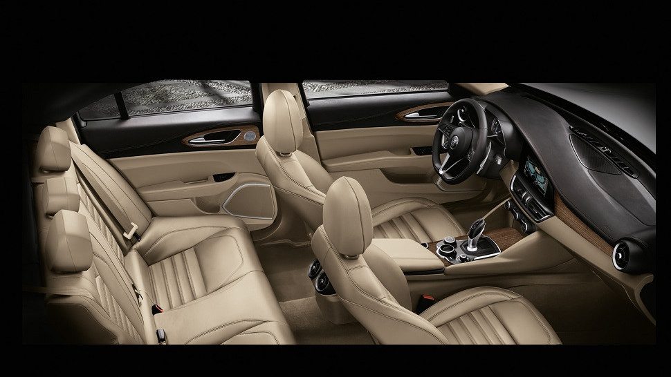 El Giulia base viene equipado con características estándar como asientos de cuero, cámara de visión trasera, sensores de estacionamiento, pantalla TFT de 7.0 pulgadas y algunos elementos deportivos como un tubo de escape dual, un eje de transmisión de fibra de carbono y un volante de fondo plano. El Giulia Ti (Turismo Internazionale) añade en su interior detalles en madera, asientos delanteros y volante con calefacción, un sistema de información y entretenimiento mejorado con pantalla de 8.8 pulgadas, radio satelital SiriusXM, y otros equipamentos