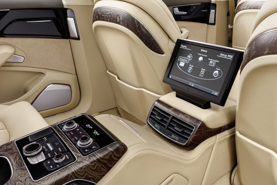 Equipado con seis puertas, el A8 L extendido ofrece espacio para seis pasajeros distribuidos en tres líneas de asientos orientadas hacia el frente. Cada pasajero goza de un parasol individual y asiento de un lujoso cuero beige, y los afortunados pasajeros de la tercera fila también disfrutan de un refrigerador y de un sistema de entretenimiento (ver fotos).