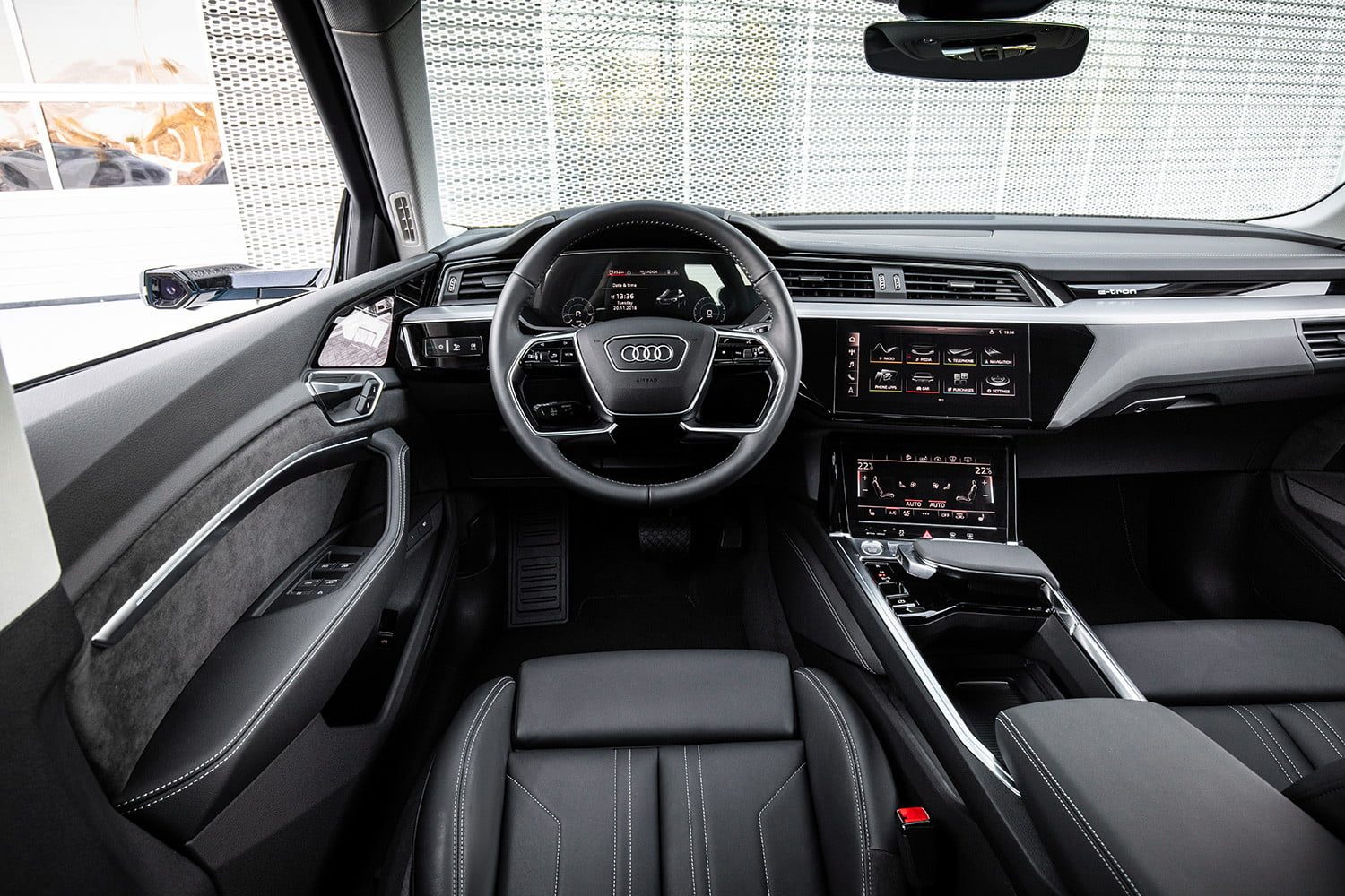 Y, sin embargo, aunque hace trampa al viento y muchas de sus claves de diseño son futuristas, el E-Tron no rompe el molde. Es reconocible como miembro de la familia Audi gracias a sus faros afilados y su parrilla hexagonal. No tiene la forma de una nave espacial, y el fabricante sabiamente se abstuvo de agregar detalles en verde o azul que claman “oh, mira, no llebvo gasolina”. La historia es la misma en el interior. El E-Tron es lujoso y está construido con materiales de alta gama, como los otros SUV de la compañía, pero no parece eléctrico hasta que presiona el botón de “Start” y no se oye un motor de seis o cuatro cilindros. La idea básica era crear un gran auto que sea eléctrico, no uno cuyo único atributo de venta fuese su batería.
