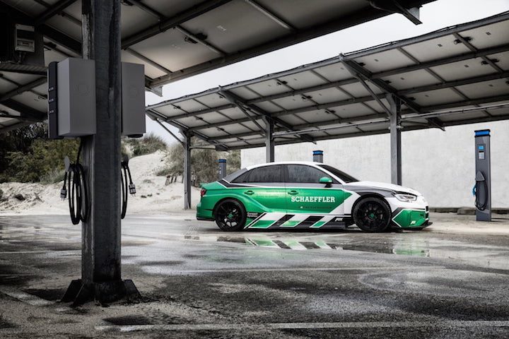 Schaeffler es el principal patrocinador del equipo Audi Sport ABT Formula E, por lo que la empresa tiene acceso al hardware adecuado. Tomó cuatro motores eléctricos del auto de carreras FE01 y los metió en el RS3. Estos producen ahora una potencia combinada de 1,180 caballos de fuerza, los que dejan a los 400 caballos producidos por el cinco en línea de 2.5 litros turboalimentado de stock del RS3 como el ronroneo de un gato.