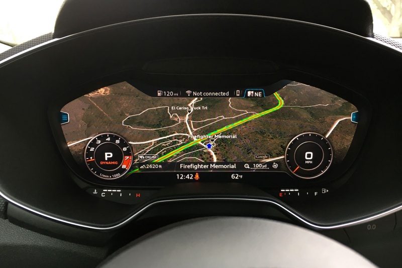El habitáculo del TT es una agradable mezcla de metal, cuero y tela. Los asientos deportivos están diseñados tanto para brindar confort en viajes largos así como para otorgar agarre en curvas cerradas. Igual, te olvidarás donde estás sentado (al menos por un momento) cuando presiones el botón Start/Stop y conozcas el Cockpit Virtual de Audi (ver fotos). El Virtual Cockpit muestra la navegación sobre los mapas Google Earth, tiene velocímetro y tacómetro digital, información de consumo de combustible y de presión de los neumáticos, y ademas ofrece opciones de entretenimiento.
