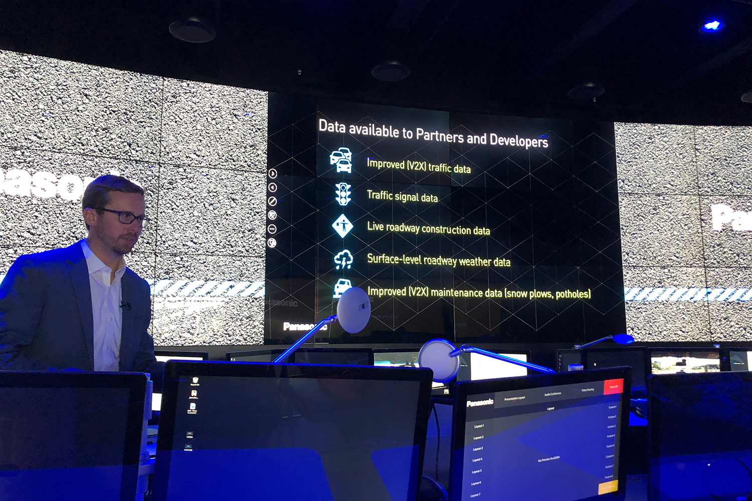 Chris Armstrong, director de movilidad inteligente de Panasonic, señala el mapa en los televisores detrás de él: “Detrás de cada uno de esos puntos azules y morados vemos los datos que estamos consumiendo de cada uno de esos vehículos», explica. “Estos autos generan, comparten y transmiten datos diez veces por segundo: el ángulo del volante, el estado del acelerador, el estado de los limpiaparabrisas, el estado del airbag, el estado del sistema de control de tracción…”.