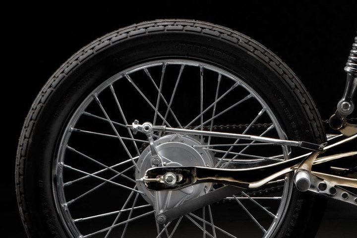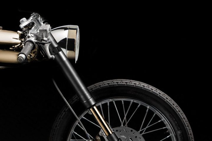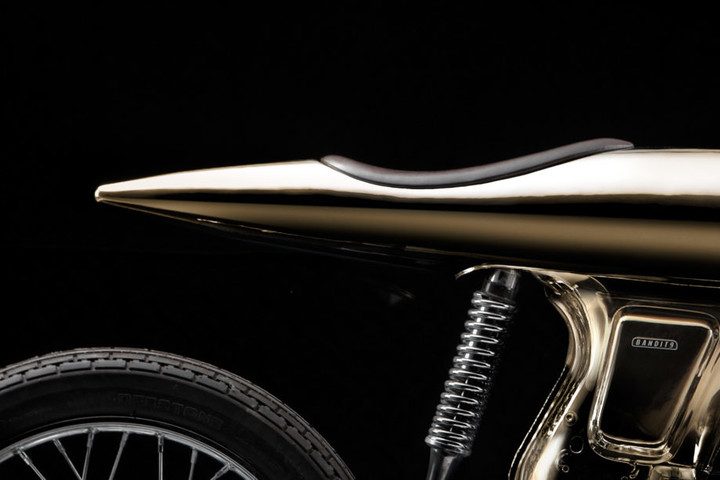 Un cuerpo de acero color champán chapado en oro, con unan cubierta de bala plateada. El arte muchas veces requiere de haya alguien que te lo pueda explicar, pero a veces (como ahora) quizá basta sólo con mirar. Esta moto con forma de bala tiene amortiguadores delanteros invertidos, una suspensión trasera dual, un brazo oscilante y un extractor de baja altura artesanal.