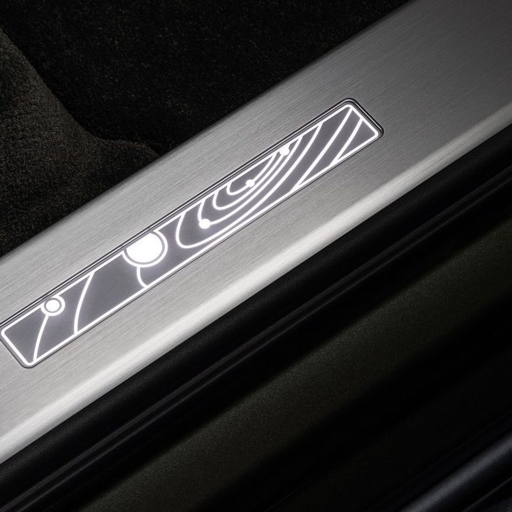 Una vez dentro de su suntuosa cabina, la primera característica personalizada que se puede ver, siempre que la puerta esté abierta, son unos hermosos estribos iluminados que representan planetas que orbitan alrededor del sol. En el tablero destacan biseles naranjas que subrayan los inusuales paneles de piedra colocados frente a los ocupantes y en los paneles de las puertas.