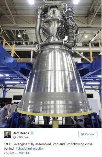 Buscando que el mundo sepa que su empresa también quiere llegar a la luna y más allá, Bezos ha tuiteado un par de fotos de un nuevo y brillante motor espacial.