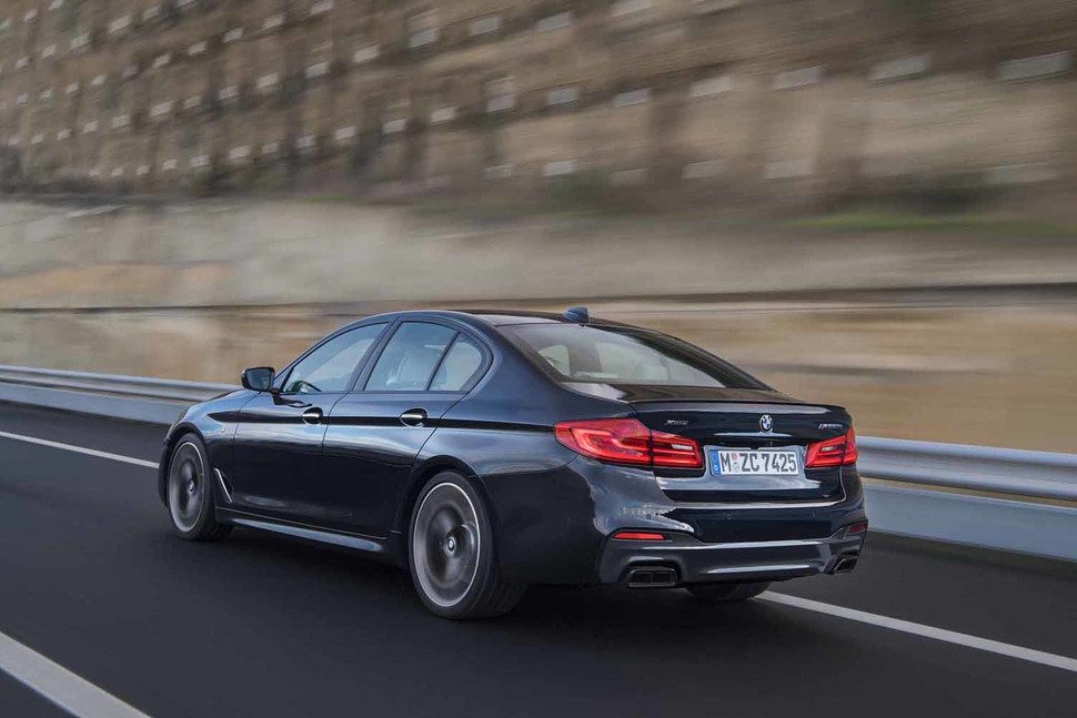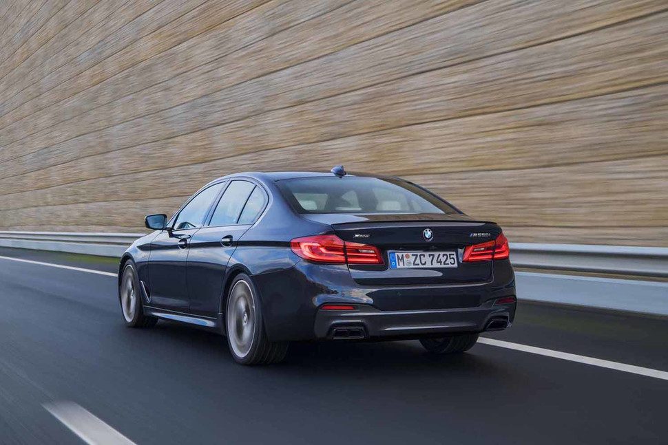 Los diseñadores han delineado un aspecto más musculoso, diferenciando aún más el M550i del Serie 5 estándar. Incluye un parachoques delantero más profundo con salidas de aire más grandes, faldones laterales y un pequeño spoiler unido a la tapa del maletero. Líneas grises y negras hacen hincapié en su apariencia discreta, y unas llantas de aleación de 19 pulgadas vienen de serie, aunque unas unidades de 20 pulgadas estarán disponibles por un costo adicional.