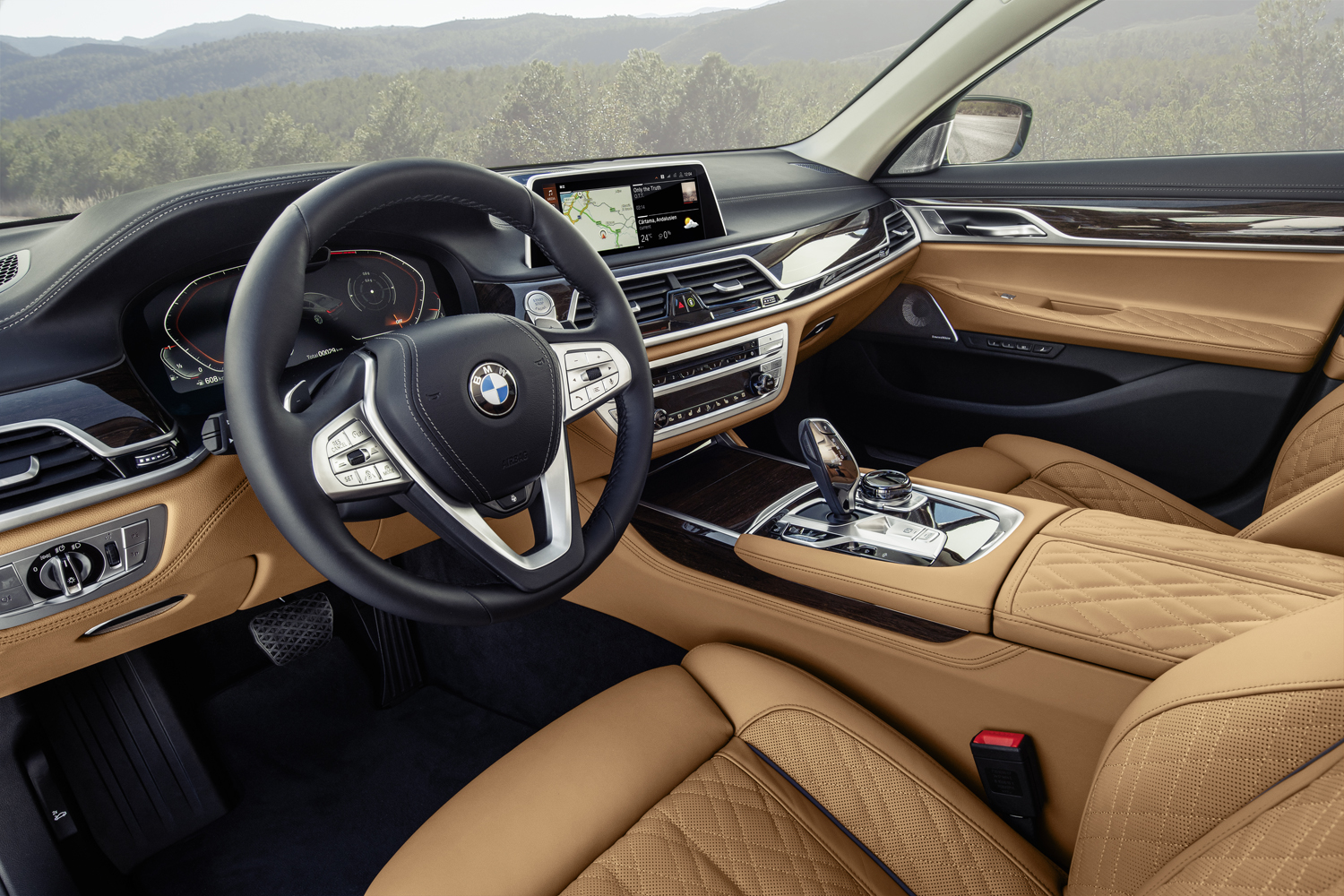 La navegación conectada, una característica estándar del Serie 7, permite a los usuarios enviar un destino desde una variedad de aplicaciones al sistema de infoentretenimiento. Una vez que mapea una ruta, el software incluso sugiere dónde estacionar a medida de que la unidad llega al destino. Cada ejemplar viene de serie con suspensión neumática, puertas de cierre suave, techo solar panorámico, sistema de sonido Harman Kardon, carga inalámbrica, punto de acceso Wi-Fi y compatibilidad con Apple CarPlay. Android Auto no estará disponible en el corto plazo. BMW también ha elaborado una serie de ayudas electrónicas para la conducción, como la advertencia de colisión y el estándar de advertencia de cambio de carril.
