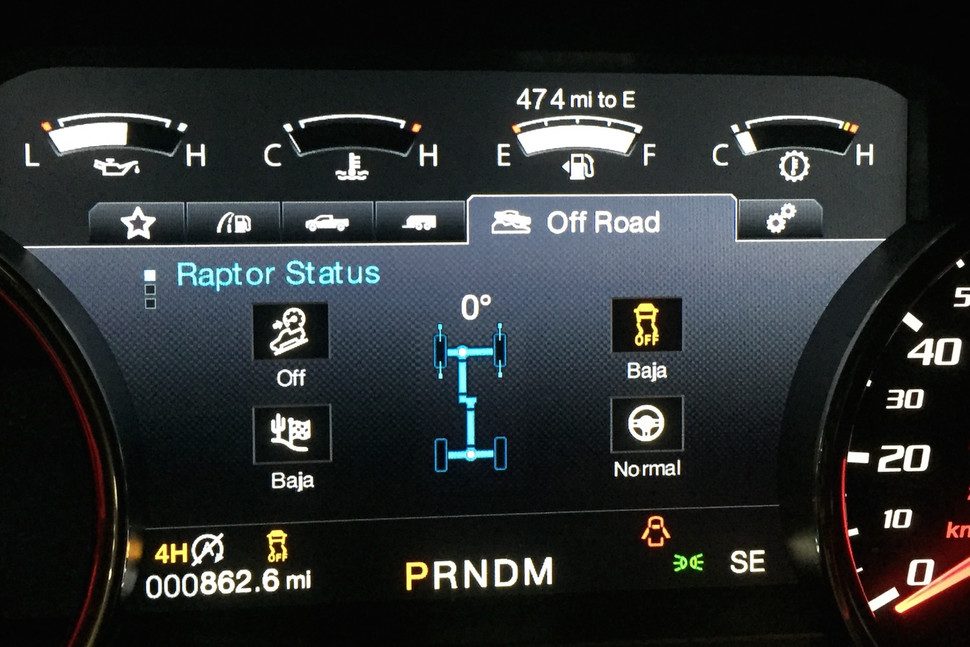 Por norma general, los modos de conducción cambian electrónicamente el carácter de un vehículo mediante la alteración aspectos tales como la dirección, la aceleración y la transmisión. Sistemas diferentes varían la efectividad, pero en el caso de vehículos todo terreno como la Raptor, los múltiples modos están para hacer frente a los diferentes tipos de terreno. a los que se puede enfrentar. Los seis modos de conducción de la Raptor incluyen el Normal, Sport, Weather, Mud/Sand, Baja, y Rock Crawl.