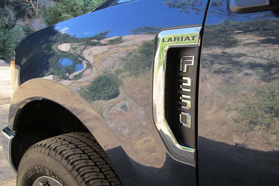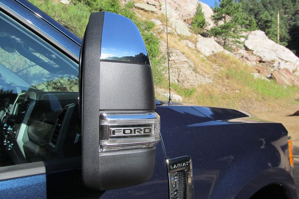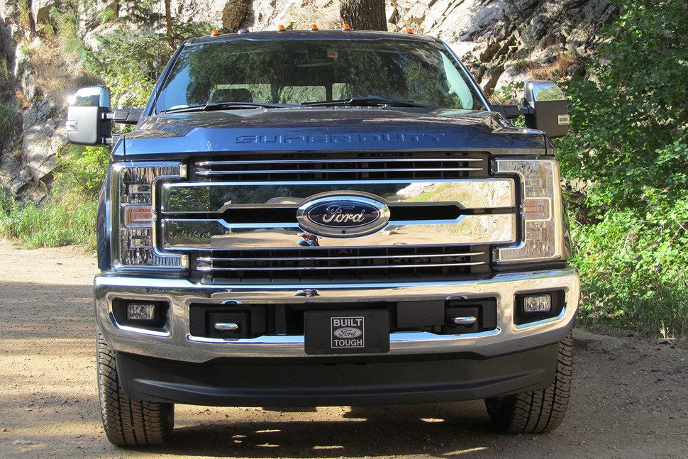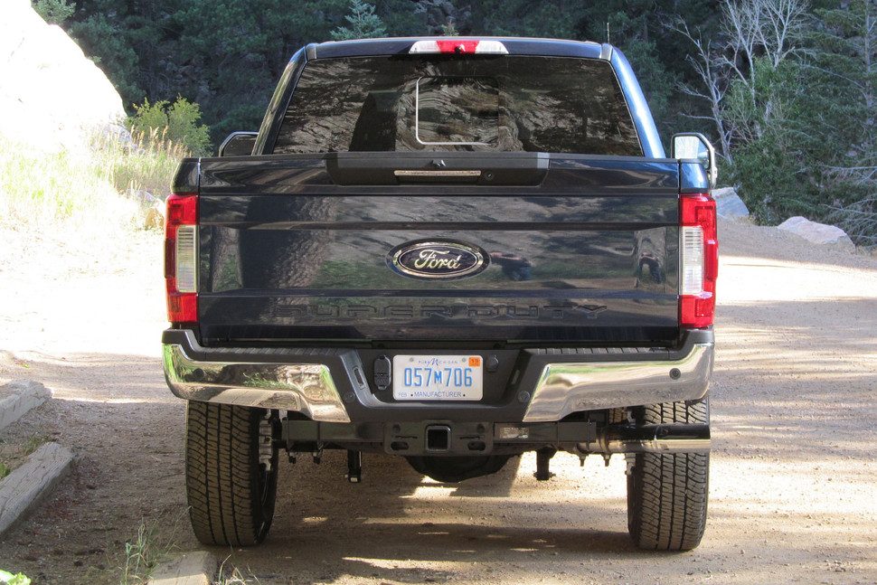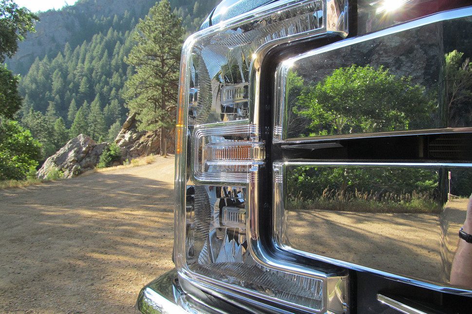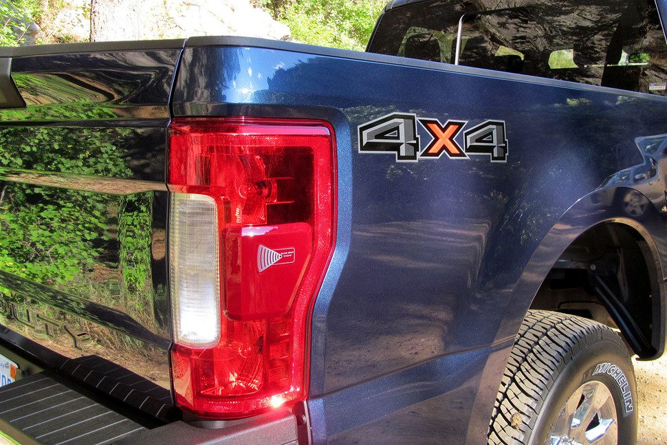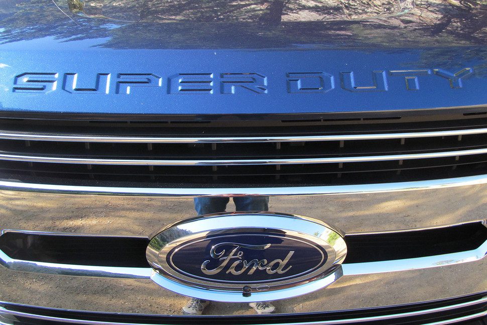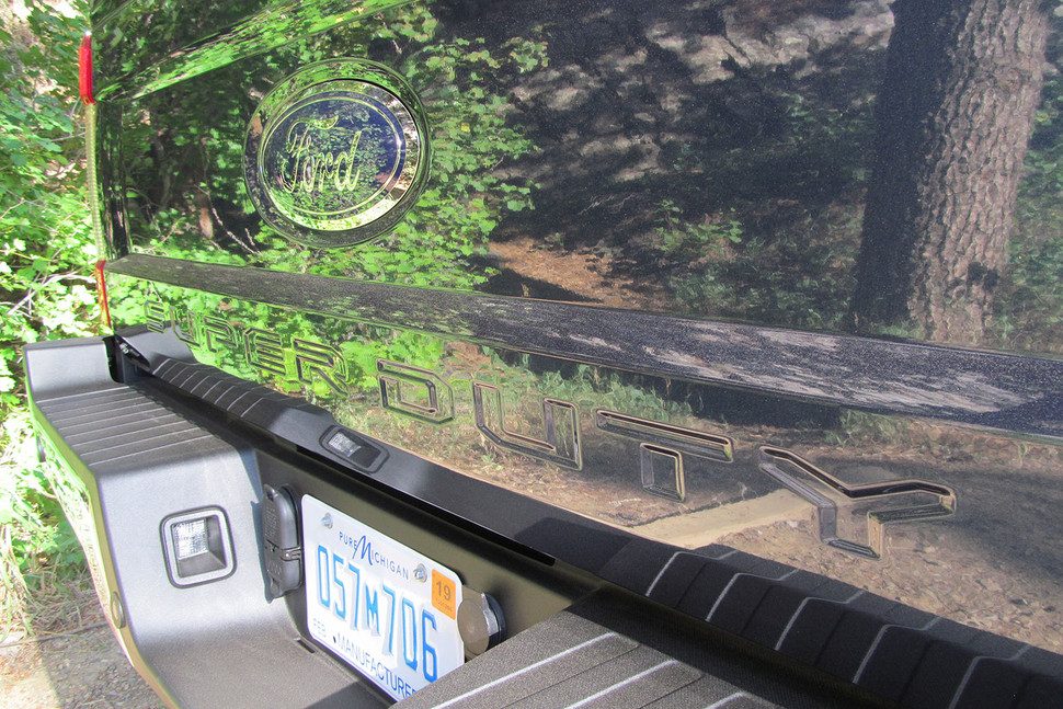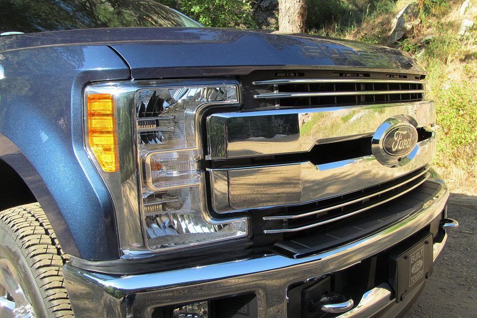 La Super Duty provoca una primera impresión bastante fuerte. En la delantera, los faros en forma de C con una distintiva línea LED dan la camioneta una apariencia más nueva, más moderna. Los faros parecen poner entre un paréntesis de corchetes a dos barras masivas de cromo, con una enorme insignia de Ford en el centro. Junto con los arcos de las ruedas y el cofre abultado, la facia delantera enfatiza el tamaño del vehículo. Es seguro que esta bestia debe intimidar bastante cuando se la ve a través del espejo retrovisor.