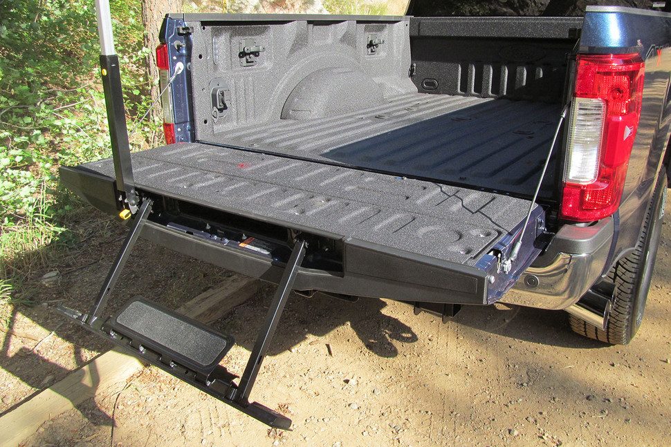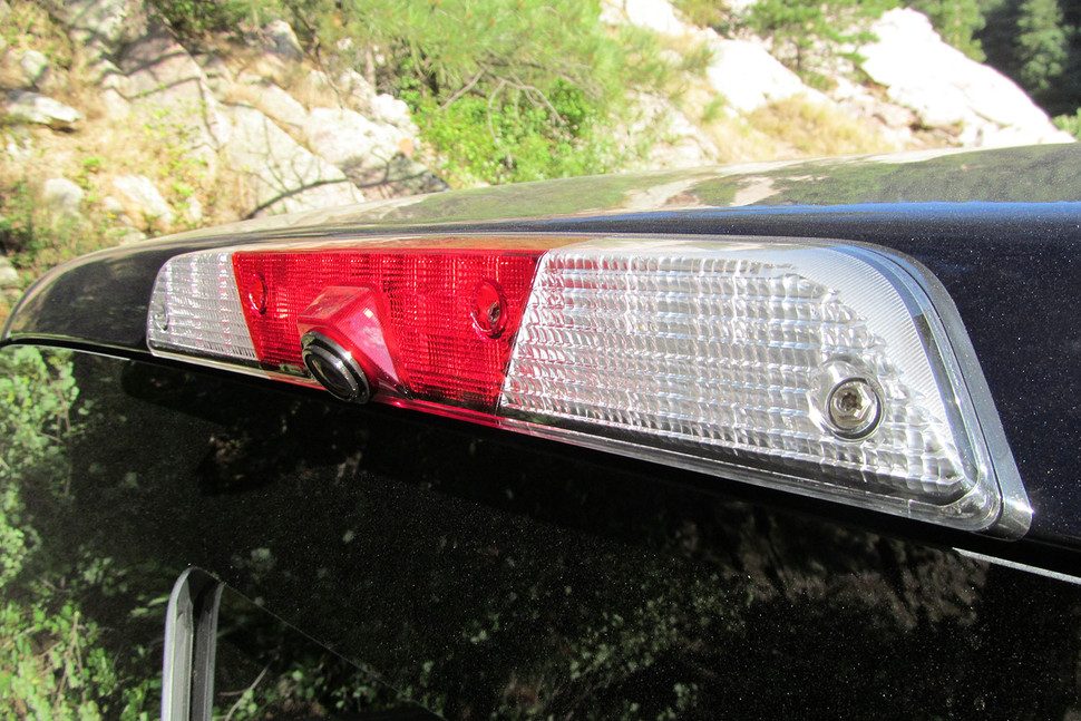 Dependiendo de cómo esté equipada, la Super Duty puede tener una cámara que mira hacia adelante en la parrilla, una cámara de visión trasera en el portón trasero, unas cámaras en los espejos laterales, y una cámara en la CHMSL (Center High-Mounted Stop Light), en la cama. Esta última es útil si estás llevando un remolque de gran tamaño con un cuello de cisne o de quinta rueda de enganche, y necesitas ver la cama para conectarlo.