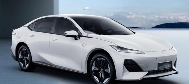 El Shenlan SL03 es un pequeño sedán eléctrico. La parte delantera del vehículo donde el capó se encuentra con la fascia se ve muy similar al Tesla Model 3.