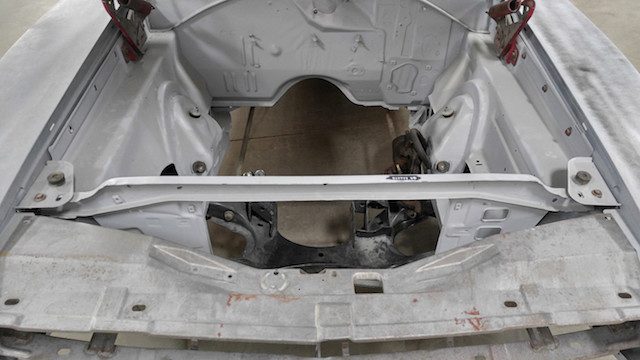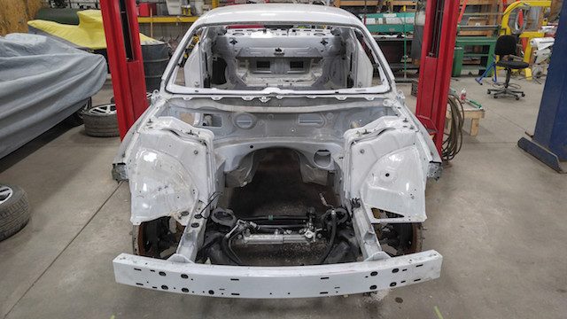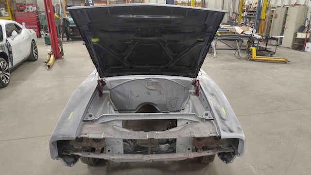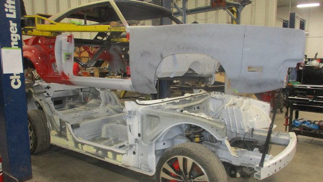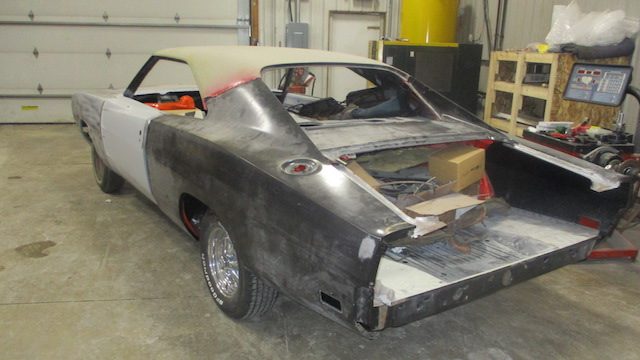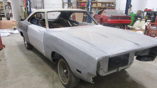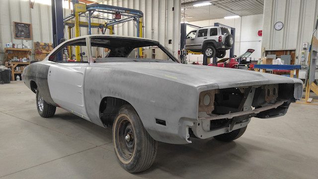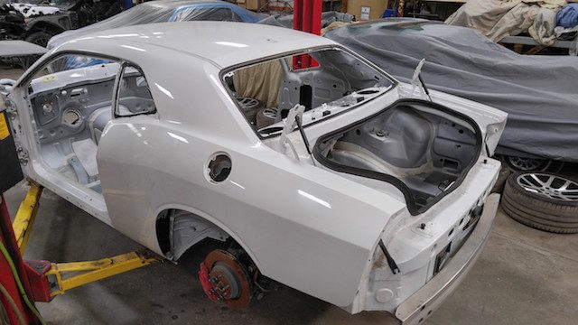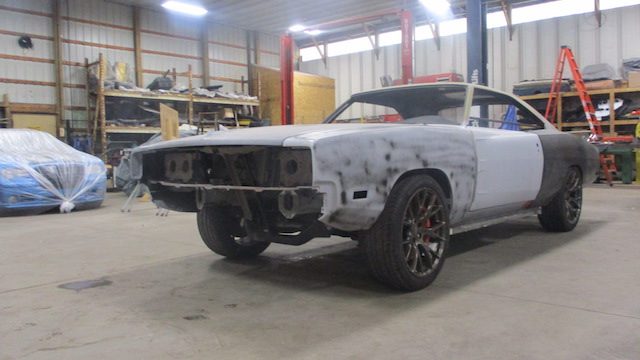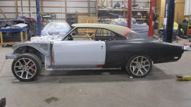 Con todas las partes ya reunidas, los constructores estaban listos para abordar la parte más difícil. Cortaron con cuidado los paneles del cuerpo de ambos modelos, limando pacientemente piezas de metal cuando era necesario, todo para dejar caer el cuerpo del Charger sobre el nuevo chasis del Challenger. Las imágenes de esta labor hacen que parezca tan sencillo como poner una tapa de plástico en un vaso de café, pero el proyecto requiere innumerables horas de trabajo. Rieles de acero tubulares fueron encargados e instalados para preservar la integridad estructural del coupé.