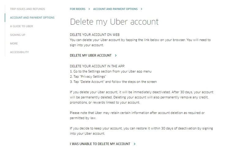 Paso 1: dirígete a la página de ayuda de Uber para eliminar tu cuenta, ve a la parte inferior de la página y haz clic en No pude eliminar mi cuenta.