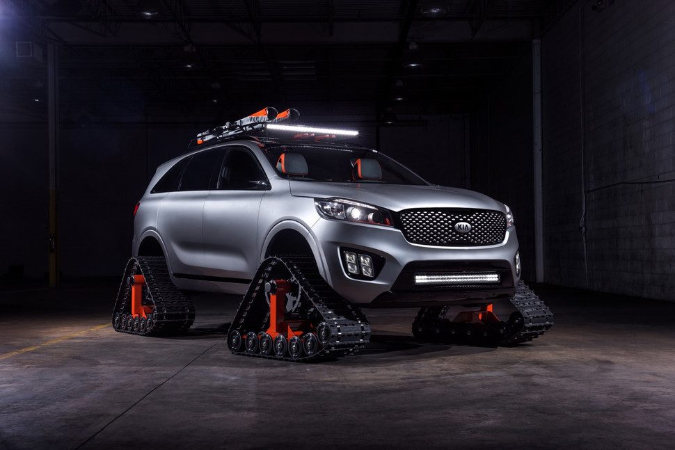Mientras que el Soul First Class en un vehículo concebido para la ciudad, el Sorento Ski Gondola está diseñado para la vida al aire libre. Como su nombre lo indica, se trata básicamente un autobús autónomo acarreará esquiadores por montañas nevadas. El interior es impermeable, y cabalga sobre un conjunto Dominator Rubber Tracks, una característica que hace de este el Kia Sorento uno de los carros más llamativos de esta versión de SEMA.