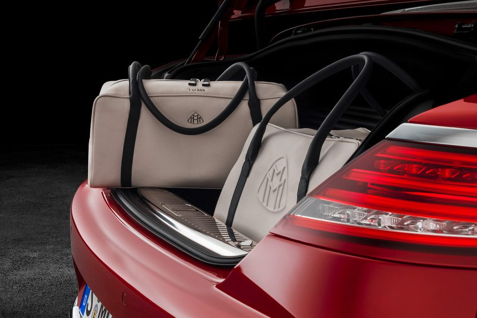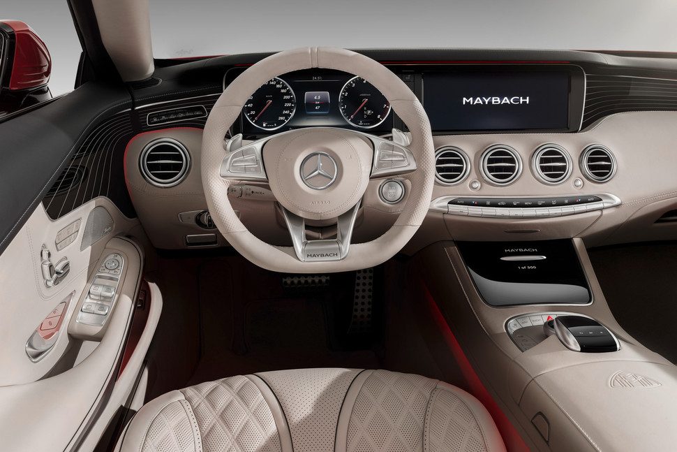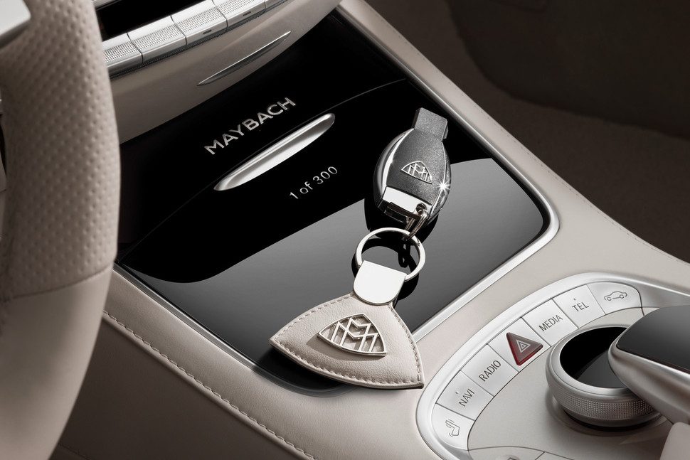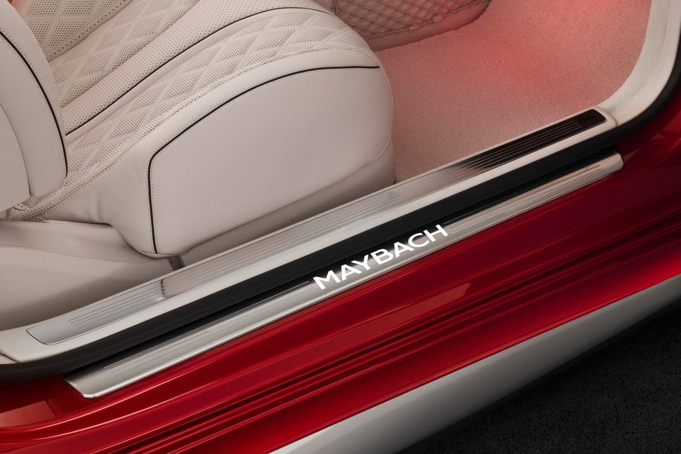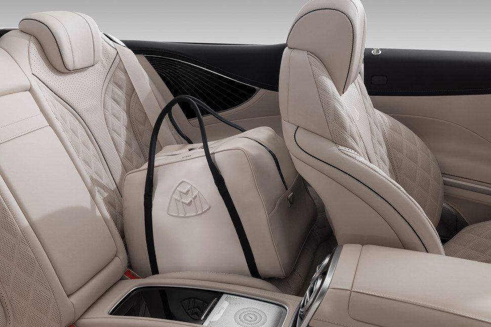 Al abrir cualquiera de las puertas del vehículo, el logotipo de Maybach se proyecta en el suelo por la iluminación de bienvenida, la cual no hace sino llevarnos al lujoso interior. Casi todas las superficies están forradas en cuero de gama alta, y los asientos cuentan con un magnífico patrón de cascada y perforaciones progresivas. El carro incluye un conjunto de equipaje Maybach, el cual —por supuesto— es de un color a juego con la configuración interior que el comprador elija.