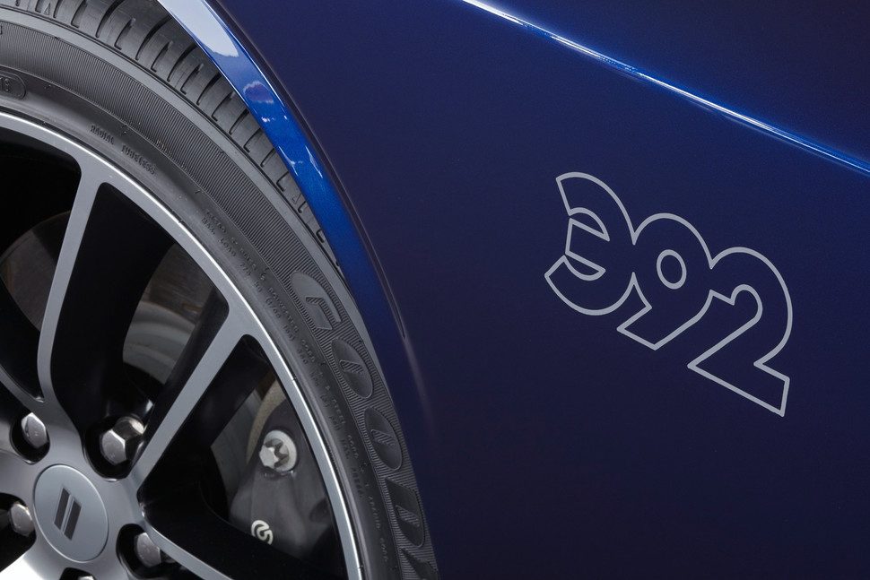 El tratamiento Mopar comienza con el exterior. La edición especial trae un trabajo de pintura de dos tonos, con un techo Pitch Black y un cuerpo color Contusion Blue o bien Billet Silver. Dodge sólo fabricará 80 ejemplares en cada esquema de color, en obvia referencia a los 80 años de Mopar. El color Pitch Black y el logotipo «Mopar 392» se aplican manualmente a la carrocería. El carro también cuenta con ruedas de 20 pulgadas, tubos de escape negros —como el Challenger SRT Hellcat— y un capó Shaker, el cual parece sacado de una película de los años setenta.