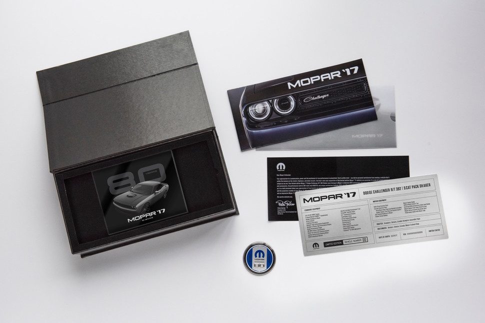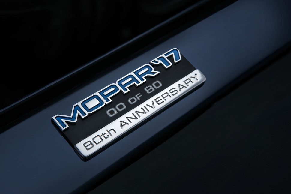 El interior cuenta con asientos deportivos con logotipos Mopar y costuras de contraste, la última de las cuales adorna los paneles de las puertas y otras partes del interior. Una insignia “serializada” viene también bajo el capó para confirmar que se trata de un carro especial. Los compradores también tendrán un «Kit de propietario» el cual incluye entre otras cosas una placa firmada por la Oficina de Diseño de Productos de FCA de los Estados Unidos, y un «certificado» que muestra las especificaciones del automóvil y su fecha de fabricación.