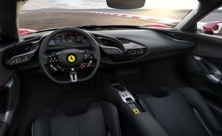 Para el habitáculo, los diseñadores eligieron un lenguaje futurista. Se trata, en palabras de Ferrari, de “una cabina envolvente de inspiración aeronáutica con especial énfasis en la instrumentación”. Gracias a su head-up display, se despliegan diversas informaciones en el parabrisas. Para la compañía, “sus gráficos de pantalla también fueron concebidos para crear un efecto 3D que es particularmente llamativo durante las transiciones”.