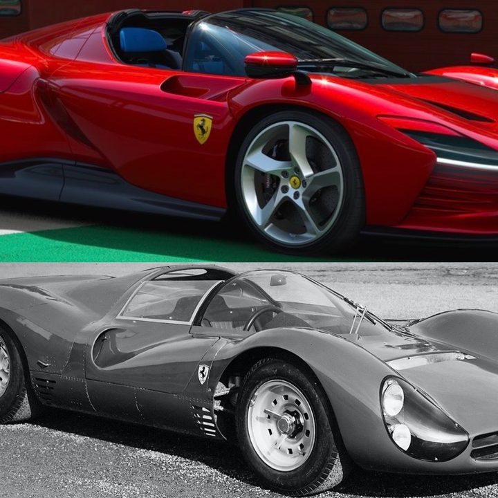 El nuevo ícono de Ferrari está inspirado en los tres prototipo de carreras que lograron los primeros tres lugares de las 24 horas de Daytona en 1967, 330P3, 330P4 y un 412P, lo cual es aparente al ver sus líneas que, si bien no replican las de los bólidos del 67, si las recuerdan y comparten con ellos su configuración de motor central.