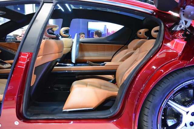 Habíamos visto ya varias imágenes de él, pero finalmente pudimos tenerlo ante nuestros ojos. El modelo de producción que se muestra en el CES 2018 se atenúa un poco desde el prototipo original. Pero su variedad de formas en lugar de una parrilla tradicional, sus faros de aspecto inusual y detalles como sus puertas tipo mariposa, hacen que el EMotion siga siendo un modelo de diseño salvaje. Su silueta —acentuada por llantas de 24 pulgadas con bordes de fibra de carbono— nos recuerda el Karma original.