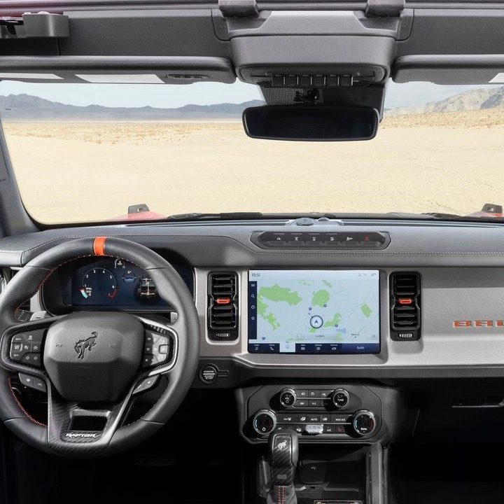 La Bronco Raptor estándar viene con un paquete de equipamiento que incluye el sistema de infoentretenimiento SYNC4 con pantalla táctil de 12 pulgadas, panel de información y reconocimiento de voz. Otras características tecnológicas disponibles incluyen una cámara exterior con capacidad de visualización de 360 grados y un paquete Lux con un sistema de audio B&O de 10 bocinas y control de crucero adaptativo.