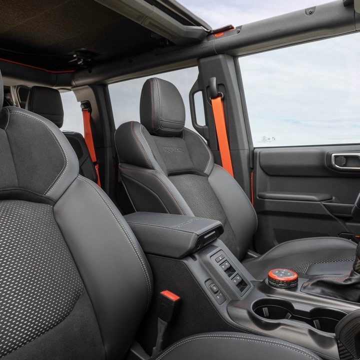 Los modelos básicos de Bronco Raptor están equipados con asientos negros de vinilo de grado marino y pisos de goma para lavarlos con facilidad. El interior cuenta con detalles en un color naranja exclusivo de productos de Ford Performance llamado Code Orange, que se ve en la malla en las puertas, costuras en el volante y el logotipo de Bronco en el panel de instrumentos, e incluso en el botón de encendido. Los puntos de contacto como las agarraderas, el bisel del volante y la palanca de cambios lucen detalles de fibra de carbono de bajo brillo.